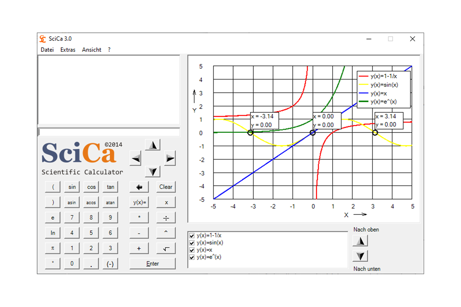 SciCa 3.0 ist ein wissenschaftlicher Taschenrechner mit dem Sie komplizierte mathematische Ausdrücke auswerten, sowie zwei-dimensionale Funktionen (y=y(x)) Funktionen grafisch darstellen kӧnnen. Um mehr Informationen für dieses Programm zu erhalten, besuchen Sie bitte die